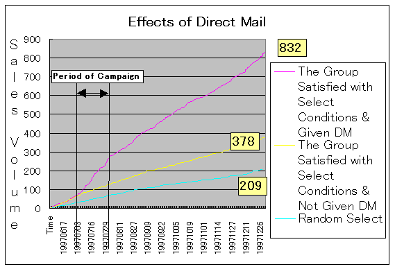 The diagram above shows the result of the DM promotion. Y axis indicates the sales of all Lavenus products. X axis indicates the time sequence from June 18, 1997 to December 27, 1997.