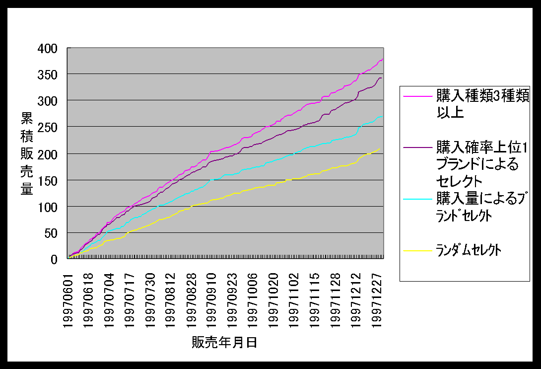 これらセレクト条件の妥当性を比較するために、実験を行った結果が図1である。横軸は、期間、縦軸はそれぞれのセレクト条件に当てはまる顧客が購入したラビナス商品の累積購入量を示している。実験店はDMを送付しているために、ラビナスとの関連性に誤差が出ると考えられるため、実験店以外の類似の店舗(会員数、立地条件、規模)のデータから、実験を行った。母集団となる対象顧客は25188人であり、1405000レコード、312MBのデータ量であった。下記の条件で選ばれる顧客は、4922人にそろえられている。図から分かる通り、ランダムに顧客をセレクトするよりは、何らかの基準(関連商品)でセレクトするほうが、ラビナスの潜在的ユーザーにヒットする確率が高いことが分かる。さらに、ラビナスの購入量で関連商品を決めるより、購入確率で選んだ方が効果が高く、また高確率の上位1ブランドによるセレクトよりも、確率の低いブランドでも複数種類のブランド購入する方が、ヒット率が高いことが推察される。さらに効果を高めるためには、最も購入確率の高い関連商品の組み合わせを求め、それを条件に顧客をセレクトすることが考えられる。ただし下記に示す通り、この手法は、関連性の高い商品のすべての組み合わせを求めなければならず、現実的には、難しい問題になる。結論として、現段階では購入種類数で顧客をセレクトする方法は、ある程度、妥当性があるということができる。
