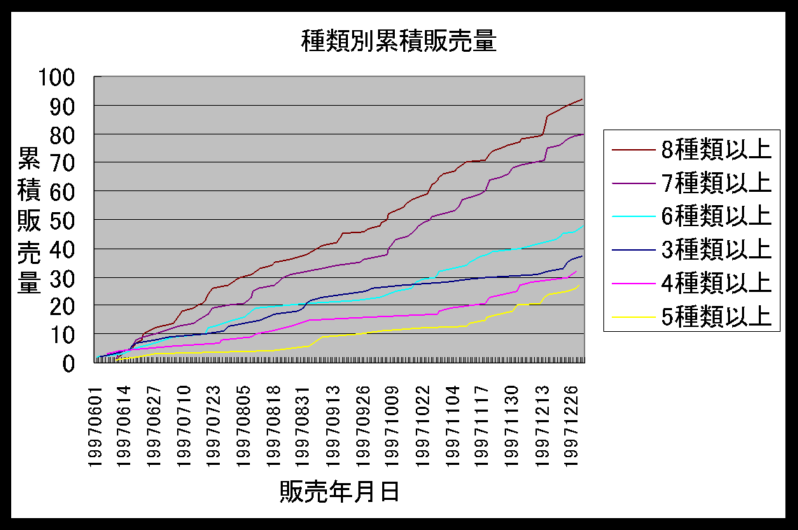 図2は、購入種類数ごとの累積販売量の比較のグラフである。横軸は期間、縦軸はそのグループに属する顧客の累積販売量である。ただし、それぞれのグループの対象顧客は、セレクト条件に合致した顧客から、ランダムに500人をセレクトしたものである。これを見ると、6種類以上購入から、購入種類数とラビナス購入量との間になんらかの関係があることが推察される。特に、7、8種類以上の顧客グループは、他のグループと比較しても、非常に関連性が高いことが分かる。
