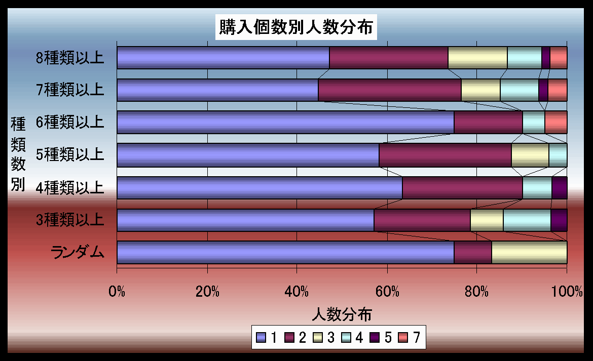 図2の累積販売量の比較では、6種類以上と7種類以上では、比較的大きな差が出ている。この原因は、顧客の行動パターンの違いから来るものと考えられる。図3は、期間中のラビナス購入数の人数分布をそれぞれのグループごとに出したものである。ここから、6種類以上は、期間中ラビナス購入量1個の顧客の割合が、7,8種類以上のグループよりも高いことが分かる。つまり、6種類以上のグループは継続的にラビナスを購入している顧客が少ないということがいえる。