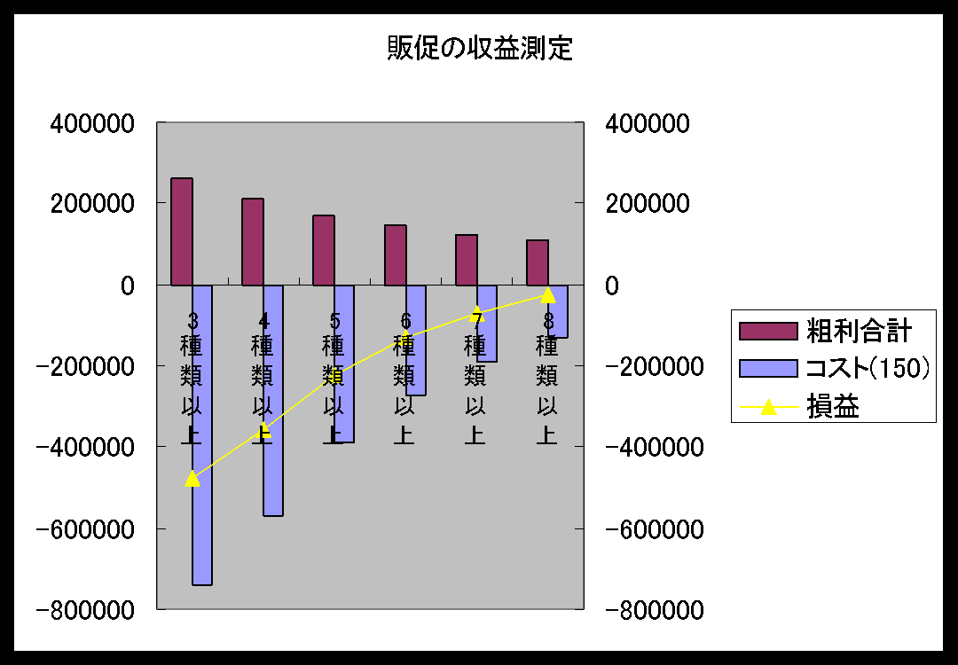 上記の販促方法の評価は基本的に、それぞれのセレクトされた顧客群の累積販売量を基準にして行われている。ここでは、他の評価基準で購入種類数別の顧客セレクトを評価する。