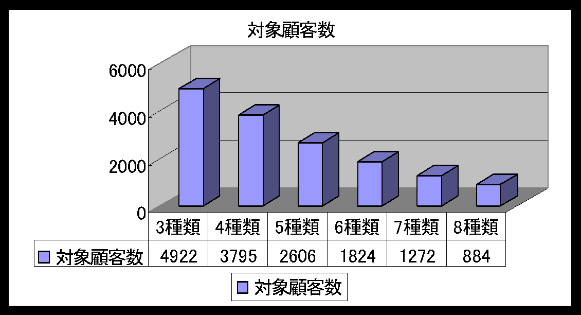 図4は、購入種類数別の一人当たり販促コストを示したものである。棒グラフは実際にかかった販促コストの総額、折れ線グラフは一人あたりの販促コストを示している。それぞれのグループは、セレクト条件に合致した全顧客であるため、それぞれの対象となる顧客数は異なる。当然、より厳しい8種類以上のセレクト条件になるほど、ヒット率が高く、一人当たりの販促コストは低下する。しかし、図5から分かるように、8種類以上の対象顧客は、884人であり、3種類以上のグループの4922人と比べればかなり少ない。現場での利用を考えると、一概に一人当たりの販促コストが低ければいいということではなく、販促の予算に合った条件を選ぶというのが、現状であろう。